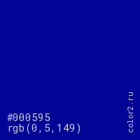 Цвет #000595 в цветовой модели RGB обозначается тремя октетами (0, 5, 149) в десятичном формате и #000595 в шестнадцатиричном (hex) формате, которые являются интенсивностью красного 0 (hex 00), интенсивность зелёного 5 (hex 05) и интенсивность синего 149 (hex 95).