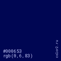 Цвет #000653 в цветовой модели RGB обозначается тремя октетами (0, 6, 83) в десятичном формате и #000653 в шестнадцатиричном (hex) формате, которые являются интенсивностью красного 0 (hex 00), интенсивность зелёного 6 (hex 06) и интенсивность синего 83 (hex 53).