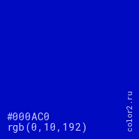 Цвет #000AC0 в цветовой модели RGB обозначается тремя октетами (0, 10, 192) в десятичном формате и #000AC0 в шестнадцатиричном (hex) формате, которые являются интенсивностью красного 0 (hex 00), интенсивность зелёного 10 (hex 0A) и интенсивность синего 192 (hex C0).