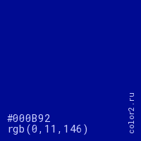 Цвет #000B92 в цветовой модели RGB обозначается тремя октетами (0, 11, 146) в десятичном формате и #000B92 в шестнадцатиричном (hex) формате, которые являются интенсивностью красного 0 (hex 00), интенсивность зелёного 11 (hex 0B) и интенсивность синего 146 (hex 92).
