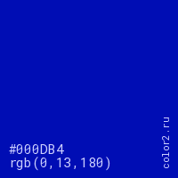 Цвет #000DB4 в цветовой модели RGB обозначается тремя октетами (0, 13, 180) в десятичном формате и #000DB4 в шестнадцатиричном (hex) формате, которые являются интенсивностью красного 0 (hex 00), интенсивность зелёного 13 (hex 0D) и интенсивность синего 180 (hex B4).