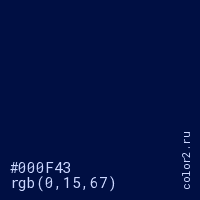 Цвет #000F43 в цветовой модели RGB обозначается тремя октетами (0, 15, 67) в десятичном формате и #000F43 в шестнадцатиричном (hex) формате, которые являются интенсивностью красного 0 (hex 00), интенсивность зелёного 15 (hex 0F) и интенсивность синего 67 (hex 43).