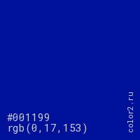 Цвет #001199 в цветовой модели RGB обозначается тремя октетами (0, 17, 153) в десятичном формате и #001199 в шестнадцатиричном (hex) формате, которые являются интенсивностью красного 0 (hex 00), интенсивность зелёного 17 (hex 11) и интенсивность синего 153 (hex 99).