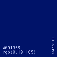 Цвет #001369 в цветовой модели RGB обозначается тремя октетами (0, 19, 105) в десятичном формате и #001369 в шестнадцатиричном (hex) формате, которые являются интенсивностью красного 0 (hex 00), интенсивность зелёного 19 (hex 13) и интенсивность синего 105 (hex 69).