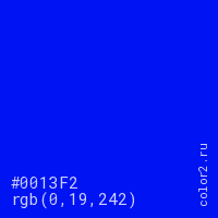 Цвет #0013F2 в цветовой модели RGB обозначается тремя октетами (0, 19, 242) в десятичном формате и #0013F2 в шестнадцатиричном (hex) формате, которые являются интенсивностью красного 0 (hex 00), интенсивность зелёного 19 (hex 13) и интенсивность синего 242 (hex F2).
