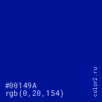 Цвет #00149A в цветовой модели RGB обозначается тремя октетами (0, 20, 154) в десятичном формате и #00149A в шестнадцатиричном (hex) формате, которые являются интенсивностью красного 0 (hex 00), интенсивность зелёного 20 (hex 14) и интенсивность синего 154 (hex 9A).