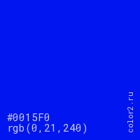 Цвет #0015F0 в цветовой модели RGB обозначается тремя октетами (0, 21, 240) в десятичном формате и #0015F0 в шестнадцатиричном (hex) формате, которые являются интенсивностью красного 0 (hex 00), интенсивность зелёного 21 (hex 15) и интенсивность синего 240 (hex F0).