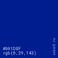 Цвет #001D8F в цветовой модели RGB обозначается тремя октетами (0, 29, 143) в десятичном формате и #001D8F в шестнадцатиричном (hex) формате, которые являются интенсивностью красного 0 (hex 00), интенсивность зелёного 29 (hex 1D) и интенсивность синего 143 (hex 8F).