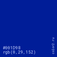 Цвет #001D98 в цветовой модели RGB обозначается тремя октетами (0, 29, 152) в десятичном формате и #001D98 в шестнадцатиричном (hex) формате, которые являются интенсивностью красного 0 (hex 00), интенсивность зелёного 29 (hex 1D) и интенсивность синего 152 (hex 98).