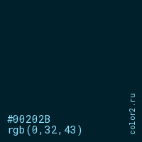 Цвет #00202B в цветовой модели RGB обозначается тремя октетами (0, 32, 43) в десятичном формате и #00202B в шестнадцатиричном (hex) формате, которые являются интенсивностью красного 0 (hex 00), интенсивность зелёного 32 (hex 20) и интенсивность синего 43 (hex 2B).