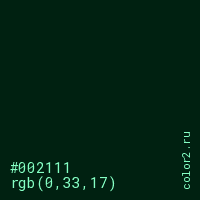 Цвет #002111 в цветовой модели RGB обозначается тремя октетами (0, 33, 17) в десятичном формате и #002111 в шестнадцатиричном (hex) формате, которые являются интенсивностью красного 0 (hex 00), интенсивность зелёного 33 (hex 21) и интенсивность синего 17 (hex 11).