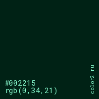 Цвет #002215 в цветовой модели RGB обозначается тремя октетами (0, 34, 21) в десятичном формате и #002215 в шестнадцатиричном (hex) формате, которые являются интенсивностью красного 0 (hex 00), интенсивность зелёного 34 (hex 22) и интенсивность синего 21 (hex 15).