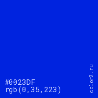 Цвет #0023DF в цветовой модели RGB обозначается тремя октетами (0, 35, 223) в десятичном формате и #0023DF в шестнадцатиричном (hex) формате, которые являются интенсивностью красного 0 (hex 00), интенсивность зелёного 35 (hex 23) и интенсивность синего 223 (hex DF).