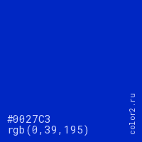 Цвет #0027C3 в цветовой модели RGB обозначается тремя октетами (0, 39, 195) в десятичном формате и #0027C3 в шестнадцатиричном (hex) формате, которые являются интенсивностью красного 0 (hex 00), интенсивность зелёного 39 (hex 27) и интенсивность синего 195 (hex C3).