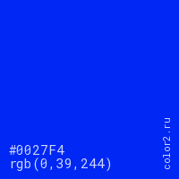Цвет #0027F4 в цветовой модели RGB обозначается тремя октетами (0, 39, 244) в десятичном формате и #0027F4 в шестнадцатиричном (hex) формате, которые являются интенсивностью красного 0 (hex 00), интенсивность зелёного 39 (hex 27) и интенсивность синего 244 (hex F4).