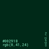 Цвет #002918 в цветовой модели RGB обозначается тремя октетами (0, 41, 24) в десятичном формате и #002918 в шестнадцатиричном (hex) формате, которые являются интенсивностью красного 0 (hex 00), интенсивность зелёного 41 (hex 29) и интенсивность синего 24 (hex 18).