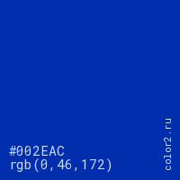Цвет #002EAC в цветовой модели RGB обозначается тремя октетами (0, 46, 172) в десятичном формате и #002EAC в шестнадцатиричном (hex) формате, которые являются интенсивностью красного 0 (hex 00), интенсивность зелёного 46 (hex 2E) и интенсивность синего 172 (hex AC).