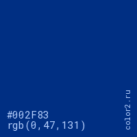 Цвет #002F83 в цветовой модели RGB обозначается тремя октетами (0, 47, 131) в десятичном формате и #002F83 в шестнадцатиричном (hex) формате, которые являются интенсивностью красного 0 (hex 00), интенсивность зелёного 47 (hex 2F) и интенсивность синего 131 (hex 83).
