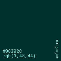 Цвет #00302C в цветовой модели RGB обозначается тремя октетами (0, 48, 44) в десятичном формате и #00302C в шестнадцатиричном (hex) формате, которые являются интенсивностью красного 0 (hex 00), интенсивность зелёного 48 (hex 30) и интенсивность синего 44 (hex 2C).