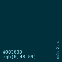 Цвет #00303B в цветовой модели RGB обозначается тремя октетами (0, 48, 59) в десятичном формате и #00303B в шестнадцатиричном (hex) формате, которые являются интенсивностью красного 0 (hex 00), интенсивность зелёного 48 (hex 30) и интенсивность синего 59 (hex 3B).