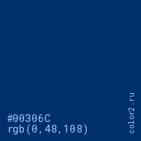 Цвет #00306C в цветовой модели RGB обозначается тремя октетами (0, 48, 108) в десятичном формате и #00306C в шестнадцатиричном (hex) формате, которые являются интенсивностью красного 0 (hex 00), интенсивность зелёного 48 (hex 30) и интенсивность синего 108 (hex 6C).