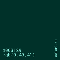 Цвет #003129 в цветовой модели RGB обозначается тремя октетами (0, 49, 41) в десятичном формате и #003129 в шестнадцатиричном (hex) формате, которые являются интенсивностью красного 0 (hex 00), интенсивность зелёного 49 (hex 31) и интенсивность синего 41 (hex 29).