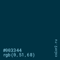 Цвет #003344 в цветовой модели RGB обозначается тремя октетами (0, 51, 68) в десятичном формате и #003344 в шестнадцатиричном (hex) формате, которые являются интенсивностью красного 0 (hex 00), интенсивность зелёного 51 (hex 33) и интенсивность синего 68 (hex 44).