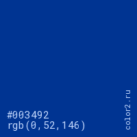 Цвет #003492 в цветовой модели RGB обозначается тремя октетами (0, 52, 146) в десятичном формате и #003492 в шестнадцатиричном (hex) формате, которые являются интенсивностью красного 0 (hex 00), интенсивность зелёного 52 (hex 34) и интенсивность синего 146 (hex 92).