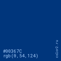 Цвет #00367C в цветовой модели RGB обозначается тремя октетами (0, 54, 124) в десятичном формате и #00367C в шестнадцатиричном (hex) формате, которые являются интенсивностью красного 0 (hex 00), интенсивность зелёного 54 (hex 36) и интенсивность синего 124 (hex 7C).