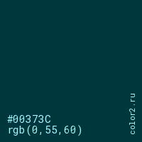 Цвет #00373C в цветовой модели RGB обозначается тремя октетами (0, 55, 60) в десятичном формате и #00373C в шестнадцатиричном (hex) формате, которые являются интенсивностью красного 0 (hex 00), интенсивность зелёного 55 (hex 37) и интенсивность синего 60 (hex 3C).