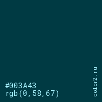 Цвет #003A43 в цветовой модели RGB обозначается тремя октетами (0, 58, 67) в десятичном формате и #003A43 в шестнадцатиричном (hex) формате, которые являются интенсивностью красного 0 (hex 00), интенсивность зелёного 58 (hex 3A) и интенсивность синего 67 (hex 43).