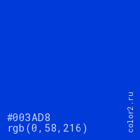 Цвет #003AD8 в цветовой модели RGB обозначается тремя октетами (0, 58, 216) в десятичном формате и #003AD8 в шестнадцатиричном (hex) формате, которые являются интенсивностью красного 0 (hex 00), интенсивность зелёного 58 (hex 3A) и интенсивность синего 216 (hex D8).