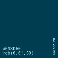 Цвет #003D50 в цветовой модели RGB обозначается тремя октетами (0, 61, 80) в десятичном формате и #003D50 в шестнадцатиричном (hex) формате, которые являются интенсивностью красного 0 (hex 00), интенсивность зелёного 61 (hex 3D) и интенсивность синего 80 (hex 50).