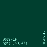 Цвет #003F2F в цветовой модели RGB обозначается тремя октетами (0, 63, 47) в десятичном формате и #003F2F в шестнадцатиричном (hex) формате, которые являются интенсивностью красного 0 (hex 00), интенсивность зелёного 63 (hex 3F) и интенсивность синего 47 (hex 2F).