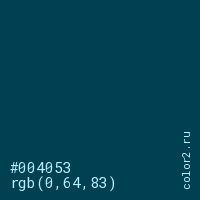 Цвет #004053 в цветовой модели RGB обозначается тремя октетами (0, 64, 83) в десятичном формате и #004053 в шестнадцатиричном (hex) формате, которые являются интенсивностью красного 0 (hex 00), интенсивность зелёного 64 (hex 40) и интенсивность синего 83 (hex 53).