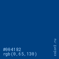 Цвет #004182 в цветовой модели RGB обозначается тремя октетами (0, 65, 130) в десятичном формате и #004182 в шестнадцатиричном (hex) формате, которые являются интенсивностью красного 0 (hex 00), интенсивность зелёного 65 (hex 41) и интенсивность синего 130 (hex 82).