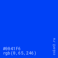 Цвет #0041F6 в цветовой модели RGB обозначается тремя октетами (0, 65, 246) в десятичном формате и #0041F6 в шестнадцатиричном (hex) формате, которые являются интенсивностью красного 0 (hex 00), интенсивность зелёного 65 (hex 41) и интенсивность синего 246 (hex F6).