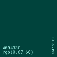 Цвет #00433C в цветовой модели RGB обозначается тремя октетами (0, 67, 60) в десятичном формате и #00433C в шестнадцатиричном (hex) формате, которые являются интенсивностью красного 0 (hex 00), интенсивность зелёного 67 (hex 43) и интенсивность синего 60 (hex 3C).