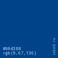 Цвет #004388 в цветовой модели RGB обозначается тремя октетами (0, 67, 136) в десятичном формате и #004388 в шестнадцатиричном (hex) формате, которые являются интенсивностью красного 0 (hex 00), интенсивность зелёного 67 (hex 43) и интенсивность синего 136 (hex 88).
