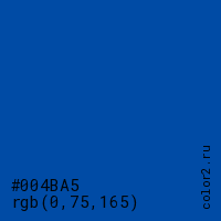 Цвет #004BA5 в цветовой модели RGB обозначается тремя октетами (0, 75, 165) в десятичном формате и #004BA5 в шестнадцатиричном (hex) формате, которые являются интенсивностью красного 0 (hex 00), интенсивность зелёного 75 (hex 4B) и интенсивность синего 165 (hex A5).