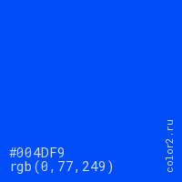 Цвет #004DF9 в цветовой модели RGB обозначается тремя октетами (0, 77, 249) в десятичном формате и #004DF9 в шестнадцатиричном (hex) формате, которые являются интенсивностью красного 0 (hex 00), интенсивность зелёного 77 (hex 4D) и интенсивность синего 249 (hex F9).
