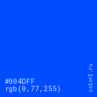 Цвет #004DFF в цветовой модели RGB обозначается тремя октетами (0, 77, 255) в десятичном формате и #004DFF в шестнадцатиричном (hex) формате, которые являются интенсивностью красного 0 (hex 00), интенсивность зелёного 77 (hex 4D) и интенсивность синего 255 (hex FF).