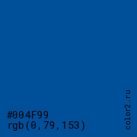 Цвет #004F99 в цветовой модели RGB обозначается тремя октетами (0, 79, 153) в десятичном формате и #004F99 в шестнадцатиричном (hex) формате, которые являются интенсивностью красного 0 (hex 00), интенсивность зелёного 79 (hex 4F) и интенсивность синего 153 (hex 99).