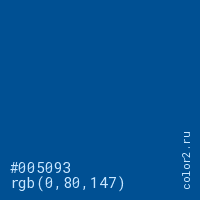 Цвет #005093 в цветовой модели RGB обозначается тремя октетами (0, 80, 147) в десятичном формате и #005093 в шестнадцатиричном (hex) формате, которые являются интенсивностью красного 0 (hex 00), интенсивность зелёного 80 (hex 50) и интенсивность синего 147 (hex 93).