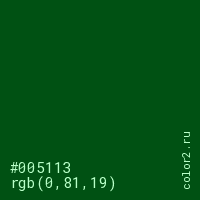 Цвет #005113 в цветовой модели RGB обозначается тремя октетами (0, 81, 19) в десятичном формате и #005113 в шестнадцатиричном (hex) формате, которые являются интенсивностью красного 0 (hex 00), интенсивность зелёного 81 (hex 51) и интенсивность синего 19 (hex 13).