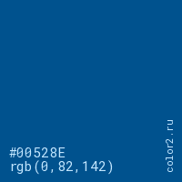 Цвет #00528E в цветовой модели RGB обозначается тремя октетами (0, 82, 142) в десятичном формате и #00528E в шестнадцатиричном (hex) формате, которые являются интенсивностью красного 0 (hex 00), интенсивность зелёного 82 (hex 52) и интенсивность синего 142 (hex 8E).