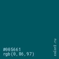 Цвет #005661 в цветовой модели RGB обозначается тремя октетами (0, 86, 97) в десятичном формате и #005661 в шестнадцатиричном (hex) формате, которые являются интенсивностью красного 0 (hex 00), интенсивность зелёного 86 (hex 56) и интенсивность синего 97 (hex 61).