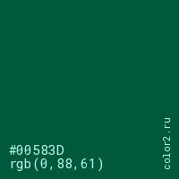 Цвет #00583D в цветовой модели RGB обозначается тремя октетами (0, 88, 61) в десятичном формате и #00583D в шестнадцатиричном (hex) формате, которые являются интенсивностью красного 0 (hex 00), интенсивность зелёного 88 (hex 58) и интенсивность синего 61 (hex 3D).