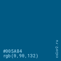 Цвет #005A84 в цветовой модели RGB обозначается тремя октетами (0, 90, 132) в десятичном формате и #005A84 в шестнадцатиричном (hex) формате, которые являются интенсивностью красного 0 (hex 00), интенсивность зелёного 90 (hex 5A) и интенсивность синего 132 (hex 84).