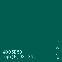 Цвет #005D50 в цветовой модели RGB обозначается тремя октетами (0, 93, 80) в десятичном формате и #005D50 в шестнадцатиричном (hex) формате, которые являются интенсивностью красного 0 (hex 00), интенсивность зелёного 93 (hex 5D) и интенсивность синего 80 (hex 50).